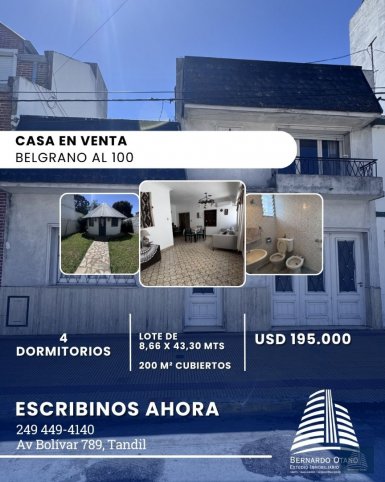 ? CASA EN VENTA ? Belgrano y Alberdi Excelente oportunidad en pleno centro de Tandil. ? Ubicación: Belgrano al 100 ? Precio: USD 195.000 ? Características principales: ?? 4 dormitorios (uno en planta alta) ? 1 baño completo ? 1 toilette ?? Living amplio ?? Comedor separado ??? Cocina independiente ? Quincho grande con parrilla ? Garage ? Superficies: ?Lote de 8,66 x 43,30 mts ?200 m² cubiertos aproximadamente ? Propiedad sólida, funcional y con ambientes bien distribuidos. Ideal para familia que busca comodidad, espacio y un gran fondo para disfrutar. ? Consultanos para coordinar visita.